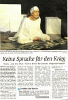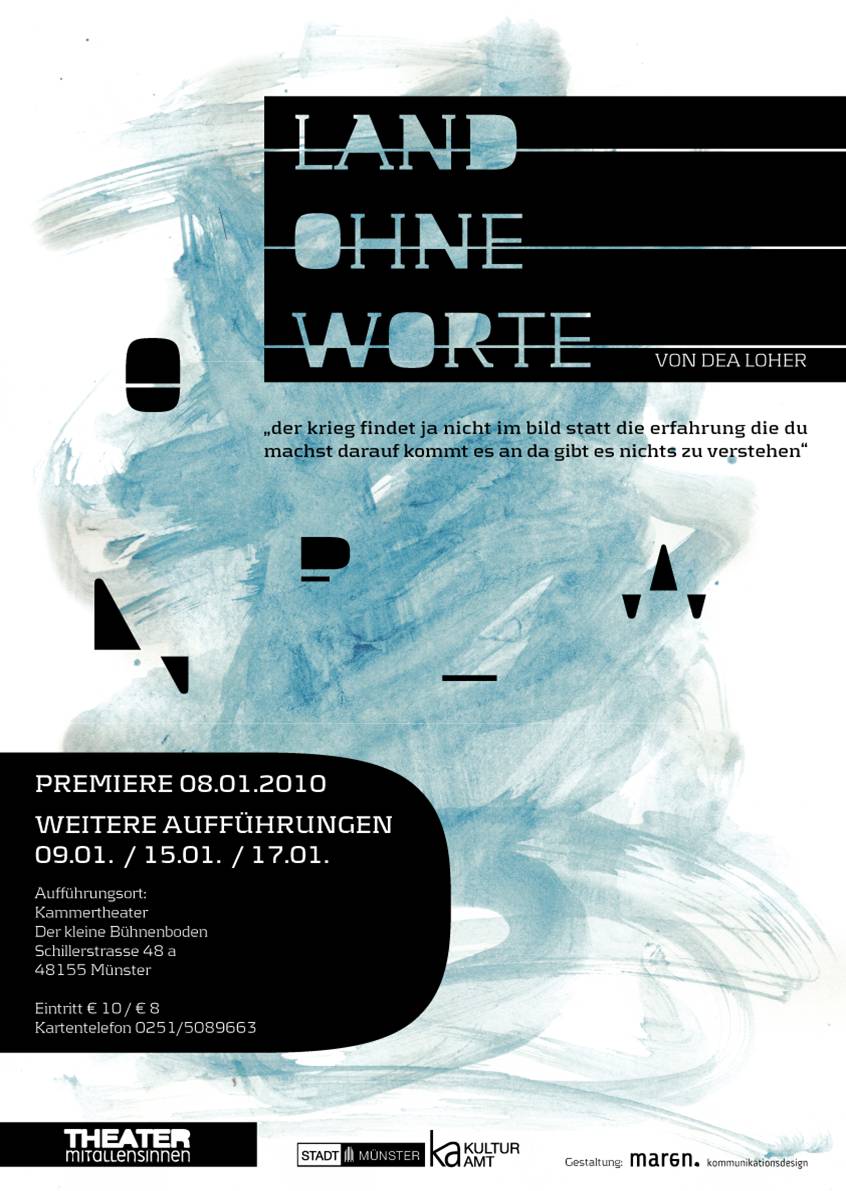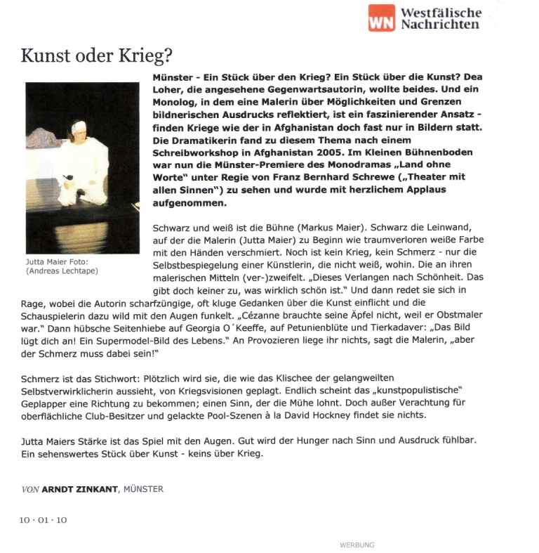 Keine Sprache für den Krieg. Wenn Kunst auf die schreckliche Wirklichkeit eines Krieges trifft, entsteht zumeist ein Aufschrei. Doch ob die Fassungslosigkeit mit Worten oder gar in einem Bild eingefangen werden kann, ist fraglich. Die zurzeit sehr erfolgreiche deutsche Dramatikerin Dea Loher hat ihre Erlebnisse nach einem Aufenthalt in Kabul in ihrem Text "Land ohne Worte" verarbeitet, der am Freitagabend vom münsterschen "Theater mit allen Sinnen" im kleinen Bühnenboden aufgeführt wurde. ... Doch eigentlich zeigt Loher mit ihrem Solostück, wie sehr nicht nur die bildende Kunst sondern auch die Sprache vor dem Gräuel eines Krieges kapitulieren muss. Die Schauspielerin Jutta Maier hat diese Hilflosigkeit eindrucksvoll umgesetzt. MZ: 11.01.10 Heiko Ostendorf Kunst oder Krieg? Ein Stück über den Krieg? Ein Stück über die Kunst? Dea Loher, die angesehene Gegenwartsautorin wollte beides. Schwarz und weiß ist die Bühne. Schwarz die Leinwand, auf der die Malerin zu beginn wie traumverloren weiße Farbe mit den Händen verschmiert. Noch ist kein Krieg, kein Schmerz - nur die Selbstbespiegelung einer Künstlerin, die nicht weiß wohin. ........ Jutta Maiers Stärke ist das Spiel mit den Augen. Gut wird der Hunger nach Sinn und Ausdruck fühlbar. Ein sehenswertes Stück über Kunst - keins über Krieg. WN: 11.01.10 Arndt Zinkant