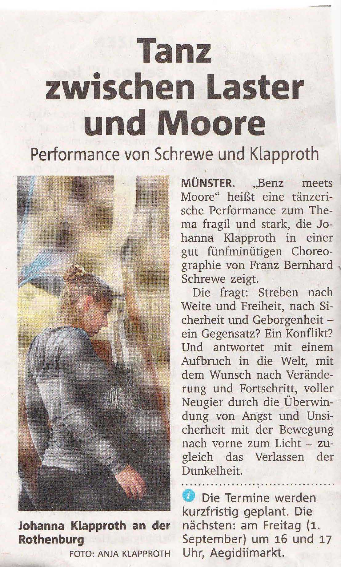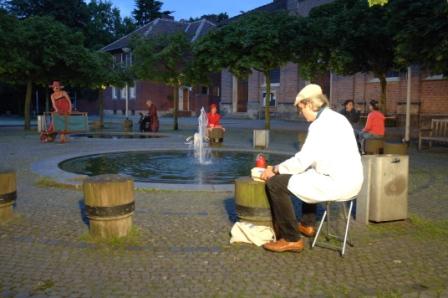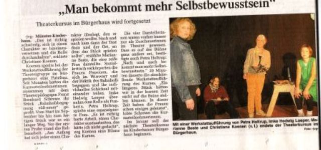 Münster zeigt PLATZEIN - PLATZAUS Wie in einem Straßencafe sitzend an einem pulsierenden Platz im Herzen einer Stadt; so der Blickwinkel des Zuschauers Hier passiert auf den ersten Blick Alltägliches: Menschen warten, gehen aneinander vorüber, treffen, begegnen oder versammeln sich. Alles Alltägliche, Leises und Absurdes auf eine Stunde reduziert. Es spielten: Johanna Albrecht, Sylvia Bodde, Hannes Demming, Sophia Demming, Johannes Drees, Peter Eixler, Marieke Fritzen, Elisabeth Glotzbach, Lea Günnewig, Heike Hedwig, Martin Heuser, Gaby Jasper, Gudrun Jorzig, Sylvia Kipper-Nowotsch, Uli Kleinert, Karl-Heinz Laschke, Sabine Leibold, Bernward Lohmann, Matthias Manglus, Albert Middel, Ari Nadkarni, Till Nonhoff, Gilla Pitz, Martina Poggel, Christa Reißmann, Walter Rittmeyer, Sandra Rieksmeier, Frederike Scheibe, Felix Schwartz, Brigitte Stork, Ulla Struck. Konzept: Christa Nonhoff Regie und Dramaturgie: Christa Nonhoff, Franz Bernhard Schrewe Co-Regie: Anja Ziegeldorf, Klaus Dieter Hedwig - Leonie Ahmer (Regieassistenz) Technik + Lichtdesign: Enes Habibovic, Peter Pielech, Patrick Häßicke Dank an: Theater im Pumpenhaus, W. Borchert Theater, Firma Jäckering, Kreativhaus, Oberverwaltungsgericht Münster, Aegidii-Kirche, Barbara Risau, Halterner Druckerei, Kleiderkammer der Caritas. ![]() ![]() ![]() ![]() ![]() ![]() ![]() ![]() ![]() ![]() Aufführungen am 25.08 / 26.08 / 27.08.2011 Bilder Peter Leßmann |