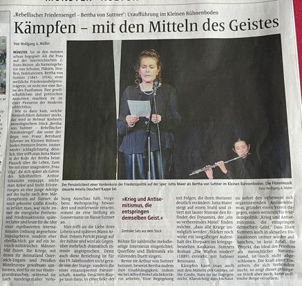 Presse WN Kämpfen - mit den Mitteln des Geistes! Sie ist den meisten schon begegnet, als die Frau der österreichiischen 2-Euro Münzen, als Namensgeberin von Schulen, Plätzen, Strassen und Institutionen. Wie es dazu kam, welche Persönlichkeit dahinter steckt, das wird in Helmut Korherrs monologischem Stück "Bertha von Suttner-Rebellischer Friedensengel", das unter der Regie von Franz Bernhard Schrewe, im Kleinen Bühnenboden Premiere feierte, immer wieder Schlagartig deutlich. Hier trifft man Jutta Maier der Rolle der Bertha von Suttner beim Plausch über ihr Leben zum Tee.................. Denn auch diese Beziehung zu ihrem Mann Arthur ist für das 19. Jahrhundert, nicht gerade von der Stange, sondern die einer emanmzipierten Partnerschaft. Amelia Deuchert - Kappe lässt dazu in einer Ecke der Bühne für zahlreiche melodieselige Intermezzi und Elektronik ein rührendes Duett singen...... Die Kraft einer einzelnen, die sich Verbündete sucht, so zeigt dieses gelungene Stück aber auch, kann politische Berge versetzen. ![]() Die Persönlichkeit einer Vordenkerin der Friedenspolitik auf der Spur: Jutta Maier als Bertha von Suttner im Kleinen Bühnenboden. Die Flötenmusik steuerte Amelia Deuchert - Kappe bei. Autor: Wolfgang A. Müller PDF/WN Kämpfen – mit den Mitteln des Geistes.pdf |