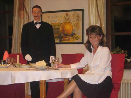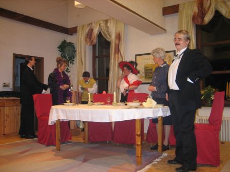 - Blaues Blut und Erbsensuppe- Der Titel gleich Programm. Im Imbissbudenbesitzer macht eine Erfindung und verdient Millionen Euro. Die Ehefrau flippt aus. Fühlt sich zu etwas höherem berufen. Sie möchte in den adeligen Reihen eingeführt werden. Am einfachsten kommt man natürlich darein, wenn man die eigene Tochter mit einem Grafen verkuppelt. Und damit das natürlich auch alles klappt, braucht die Familie einen Butler, damit man das benehmen einer aristokratischen Familie lernt. Ob das alles klappt. Ein Schwank, geschrieben vom Autor: Dieter Adam. Gespielt wurde dieser Schwank vier mal vor ausverkauftem Aufführungen von der Theatergruppe: Kultur vom Dorf - einfach weiblich" aus Bausenhagen Das Ensemble: Es spielen: Tatjana Boes; Margit Brinkmann; Beatrice Müller; Marita Nierhoff; Gaby Raffenberg; Maria Raffenberg; Maria Schlüchtermann; Martina Volmer