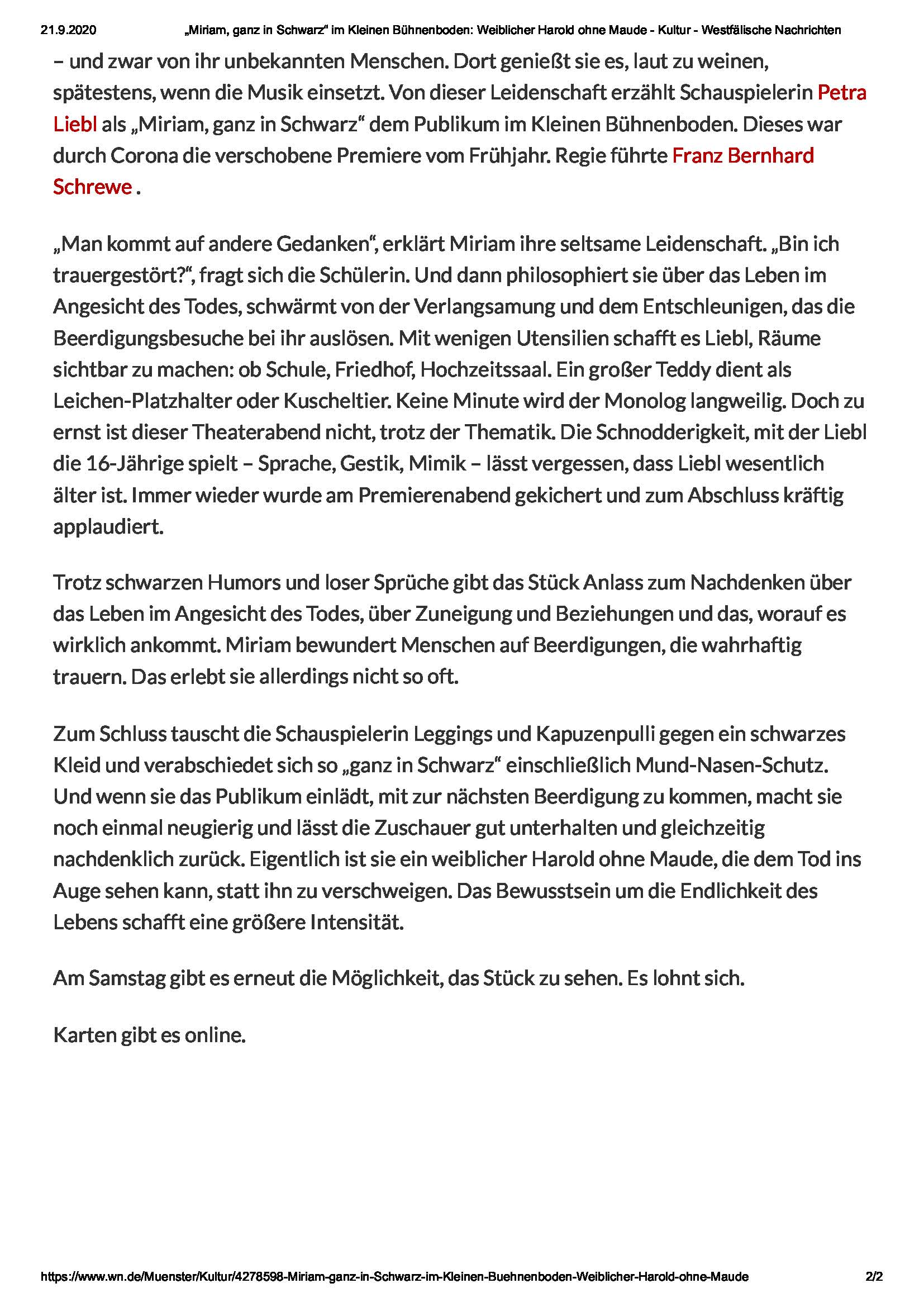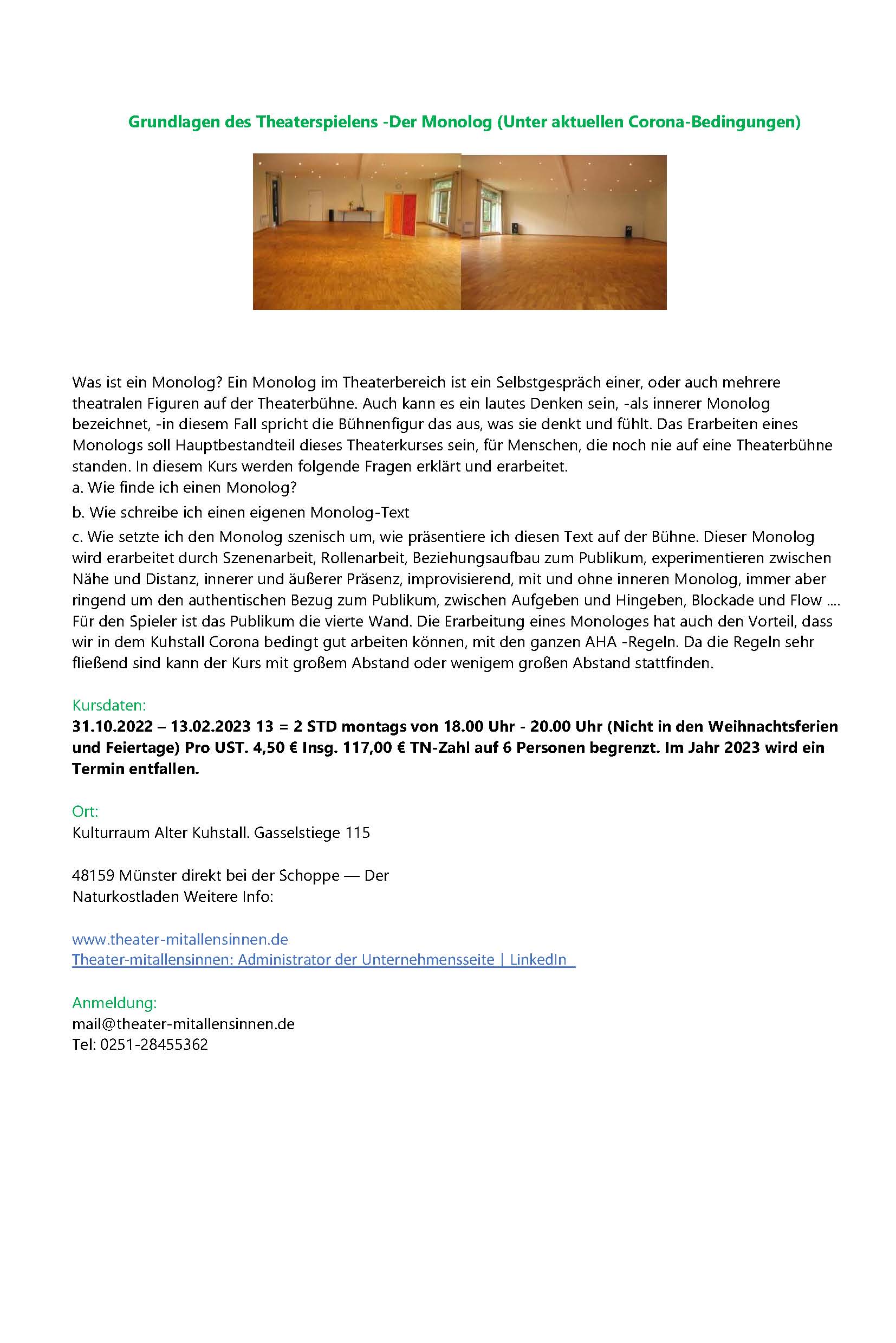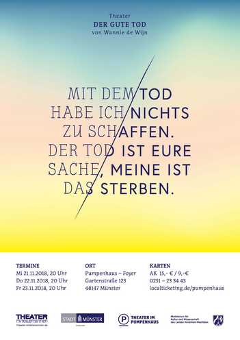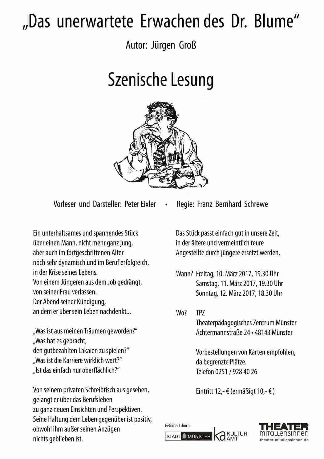 Aufführungsort. Kammertheater: Der Kleine Bühnenboden Schillerstrasse 48a 48155 Münster. Tickets sind vorrangig im Online-Vorverkauf via TicketPay erhältlich oder über