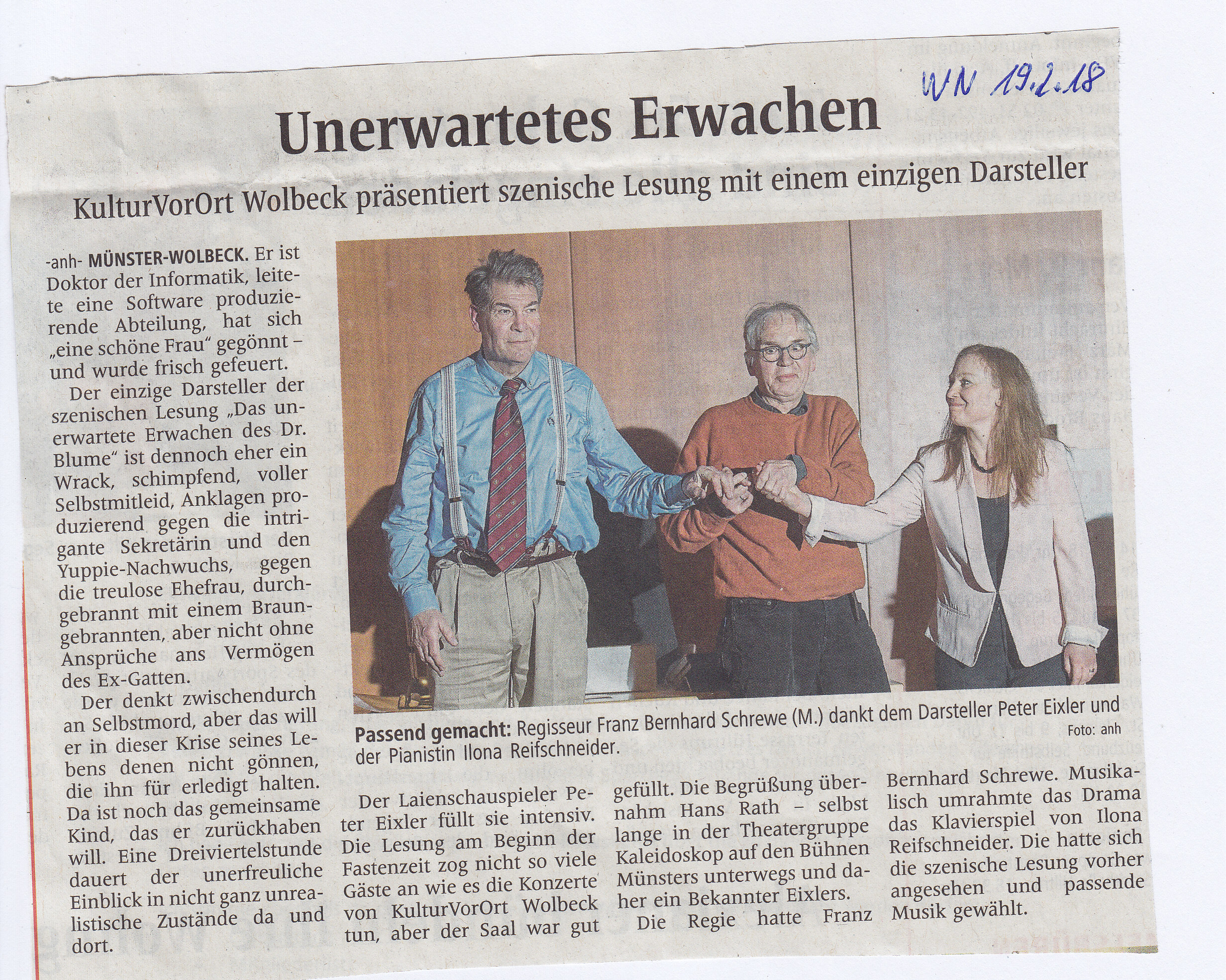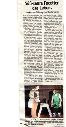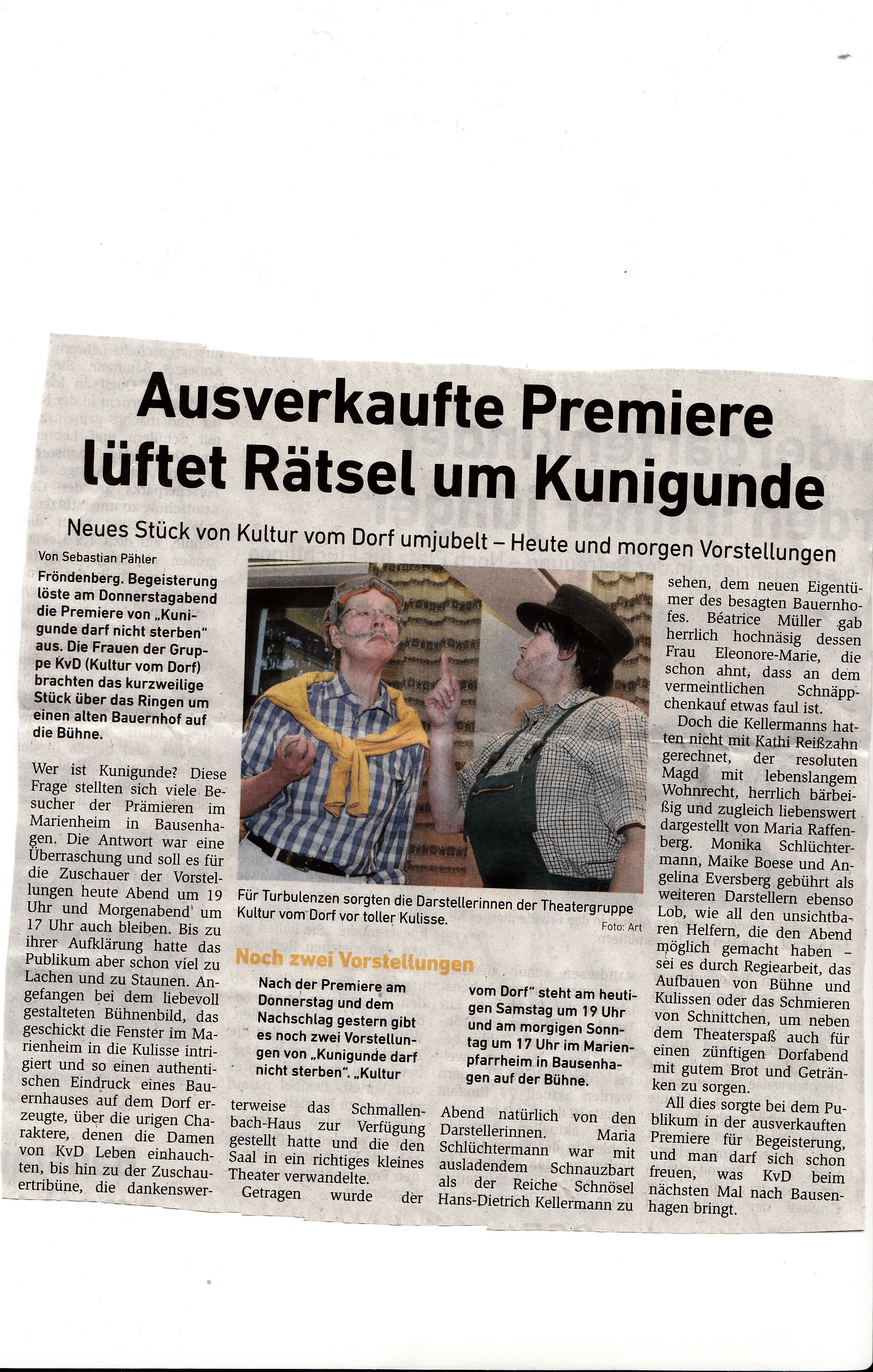 Ein Gönner mit turbulenten Schwerkraftproblemen Zeitungsausschnitt Theatergruppe Kultur vom Dorf zeigten Amateurtheater vom feinsten. Zeitungsausschnitt |