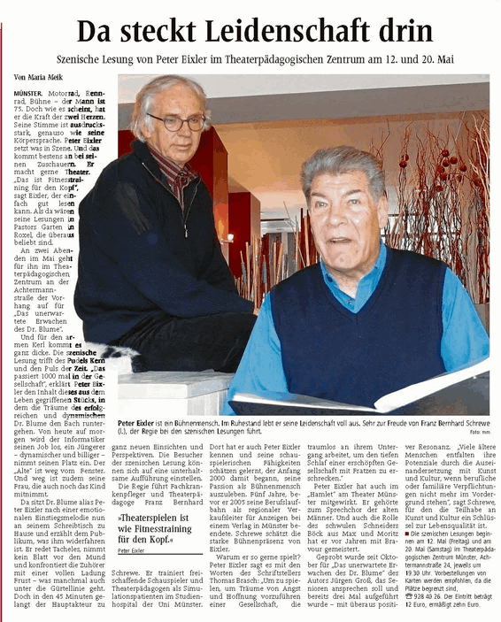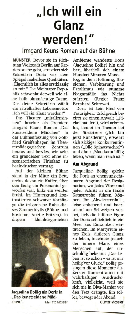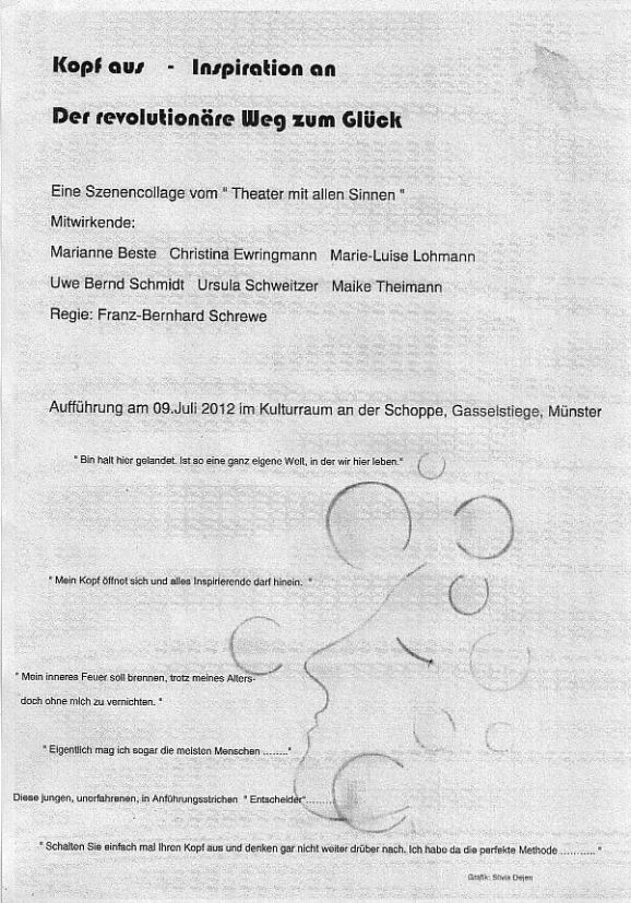 Schreibwerkstatt der VHS – Münster Leitung: Gregor Bohnensack Aufführung: 12.07.2010 Es spielen: Jennifer Giesen, Rosemarie Heinrichs, Stefan Schall, Uwe B Schmidt, Bernd Schmiegel, Sabine Schwetker, Sina Schu, Anja Wüpping – Saar, Schreibwerkstatt der VHS-Münster Gregor Bohnensack – Schlößer, Jürgen Flenker, Anette Fritzen, Claudia Sarnowski, Gesa Sumowski, Jonek Ziellenbach. Texte: Schreibwerkstatt der VHS-Münster + Ensemble theater-mitallensinnen Regie: Franz Bernhard Schrewe