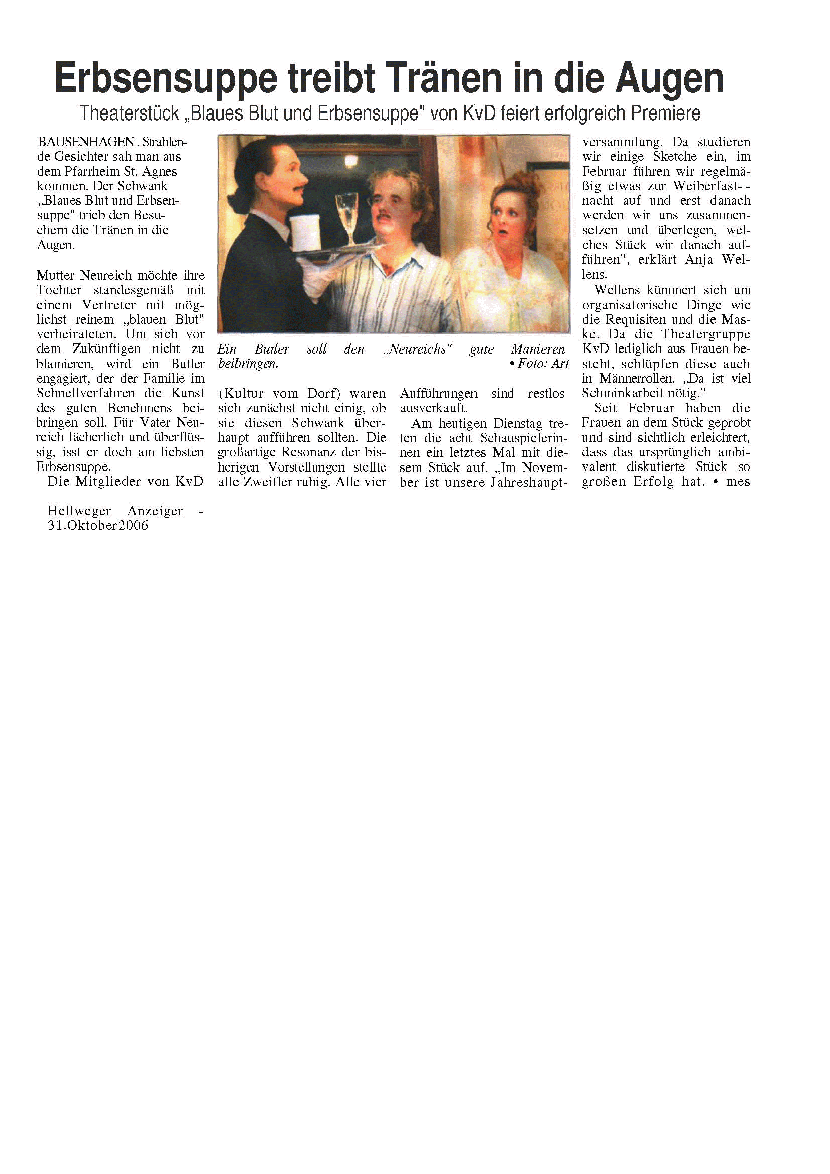 Erbsensuppe treibt Tränen in die Augen. Trbsensuppe " vom KvD feiert heaterstück "Blaues Blut und Eerfolgreich. Aus - Hellweger Anzeiger - vom 01.11.2006 |
