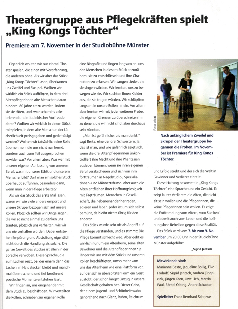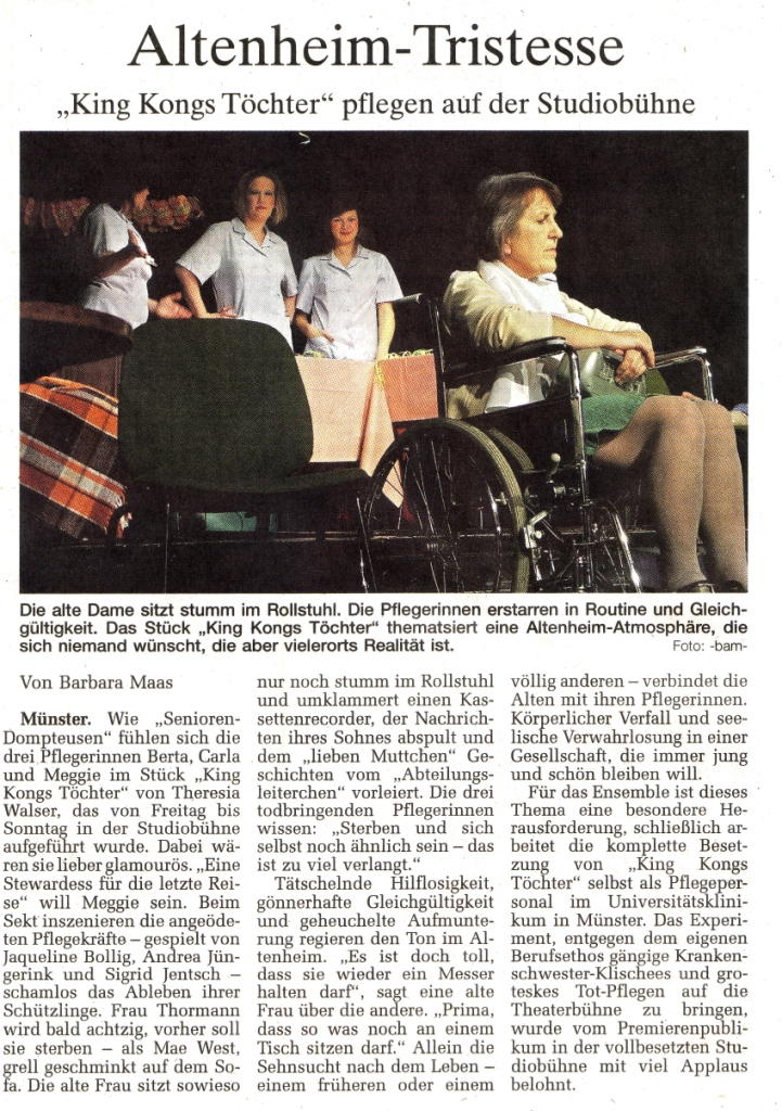 ... Altenheim - Tristesse, "King Kongs Töchter" pflegen auf der Studiobühne.....Tätschelnde Hilflosigkeit, gönnerhafte Gleichgültigkeit und geheuchelte Aufmunterung regieren den Ton im Altenheim. "Es ist doch toll, dass sie wieder ein Messer halten darf", sagt eine alte Frau über die andere....Das Experiment, entgegen dem eigenen Berufsethos gängiges Krankenschwester-Klischees und groteskes Tot-Pflegen auf die Theaterbühne zu bringen wurde vom Premierenpublikum in der vollbesetzten Studiobühne mit viel Applaus belohnt. WN: 10.11.08 Barbara Maas