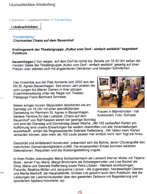 Das Stück- Autor: Ralf Kaspari, wurde von Frauen der Theatergruppe "Kultur vom Dorf - einfach weiblich" aus Bausenhagen aufgeführt. Bei fünf ausverkauften Aufführungen hatten alle Besucherinnen und Besucher ihren Spaß. Im Herbst 2006 wird es ein neues Stück von dieser Gruppe geben.