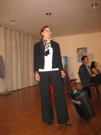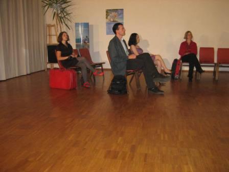 - Beat der Sehnsucht - Sehnsüchtige Blicke, Wünsche die nicht erfüllt wurden, Fernweh nach anderen Ländern, diese Formen der Sehnsucht zeigte das Ensemble in einer Flughafenhalle, Eine poetische Szenendarstellung. ----------------------------------------------- Das ist es jetzt! Dieser Bruchteil einer Sekunde, der mein Leben so radikal verändern wird. Und jetzt, jetzt wird Alles nicht mehr so schnell gehen. Um mich herum wird sich etwas verändern, Es wird sich Alles verändern. Mein Leben.Mein Alltag. Allein gelassen, weggeschickt,. In eine Stadt die erdrückend, erstickend auf mich wirkt. Aber ich habe wohl keine andere Wahl, obwohl…… ein gutes hat die Reise ja doch. Leicht wie ein Vogel mit der Maschine durch die Wolken gleiten, der Sonne entgegen. Was wäre, wenn ich einfach hier sitzen bleiben würde? Gar nicht einchecken. Den Urlaub einfach nicht antreten,? Mit baumelnden Beinen dem Flugzeug hinterherschauen und nichts tun? Keine Anstrengungen mehr. Nichts müssen. Kein Thai Chi, kein Urlaubs-Small-Talk,. Zuhause bleiben. Und drei Männer knien auf dem Boden. Ihre Schuhe haben sie ausgezogen. Ihr Blick geht nach rechts. Mekka liegt also rechts von mir, denke ich. Und steige ins Flugzeug. |