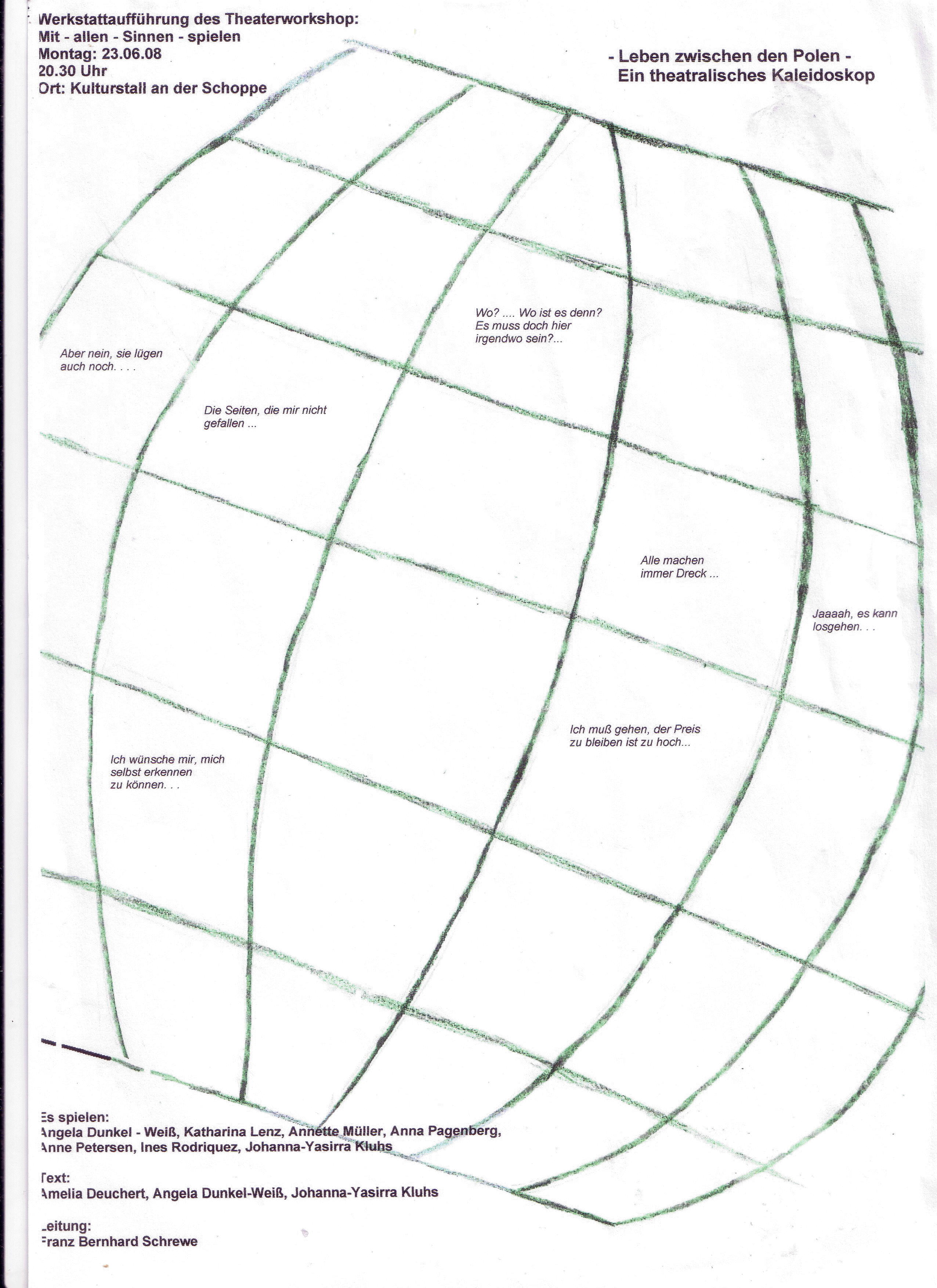 Leben zwischen den Polen. Die Zuschauer konnten aus zwei unterschiedlichen Blickwinkeln das Leben zwischen den Polen erfahren. Eingegrenzt in unterschiedlichen Feldern, wurde es erwandert über die Linien zu den einzelnen Lebensfeldern. Ein Theatrales Kaleidoskop: Text Szene und Gang- Performance führten zu einem Theaterspiel Lang anhaltender Beifall von dem Publikum belohnten die Spielerinnen - - - - - - - - - - - - - - - - - - - - - - - - - - - - - - - - - - - - - - - - - - - - - - - - - - - - - Die Seiten die mir nicht gefallen... Ich muß gehen, der Preis zu bleiben ist zu hoch... Alle machen immer nur Dreck... Ich wünsche mir, mich selbst erkennen zu können... Aber nein, sie lügen auch noch... Wo?... Wo ist es denn? Es muß doch hier irgendwo sein?... Jaaah, es kann losgehen... |