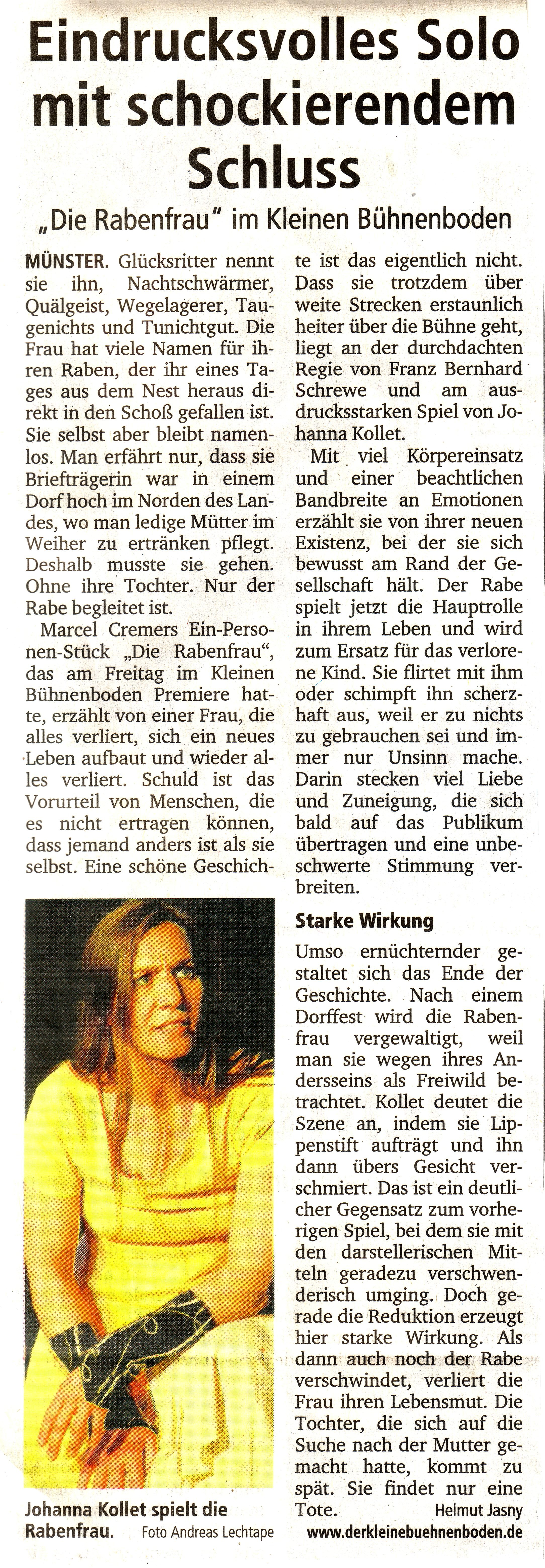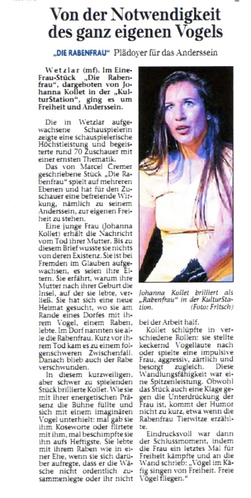 Schauspiel: Jutta Maier Bühne: Markus Maier Maske und Kostüm: Anette Fritzen Regie: Franz Bernhard Schrewe