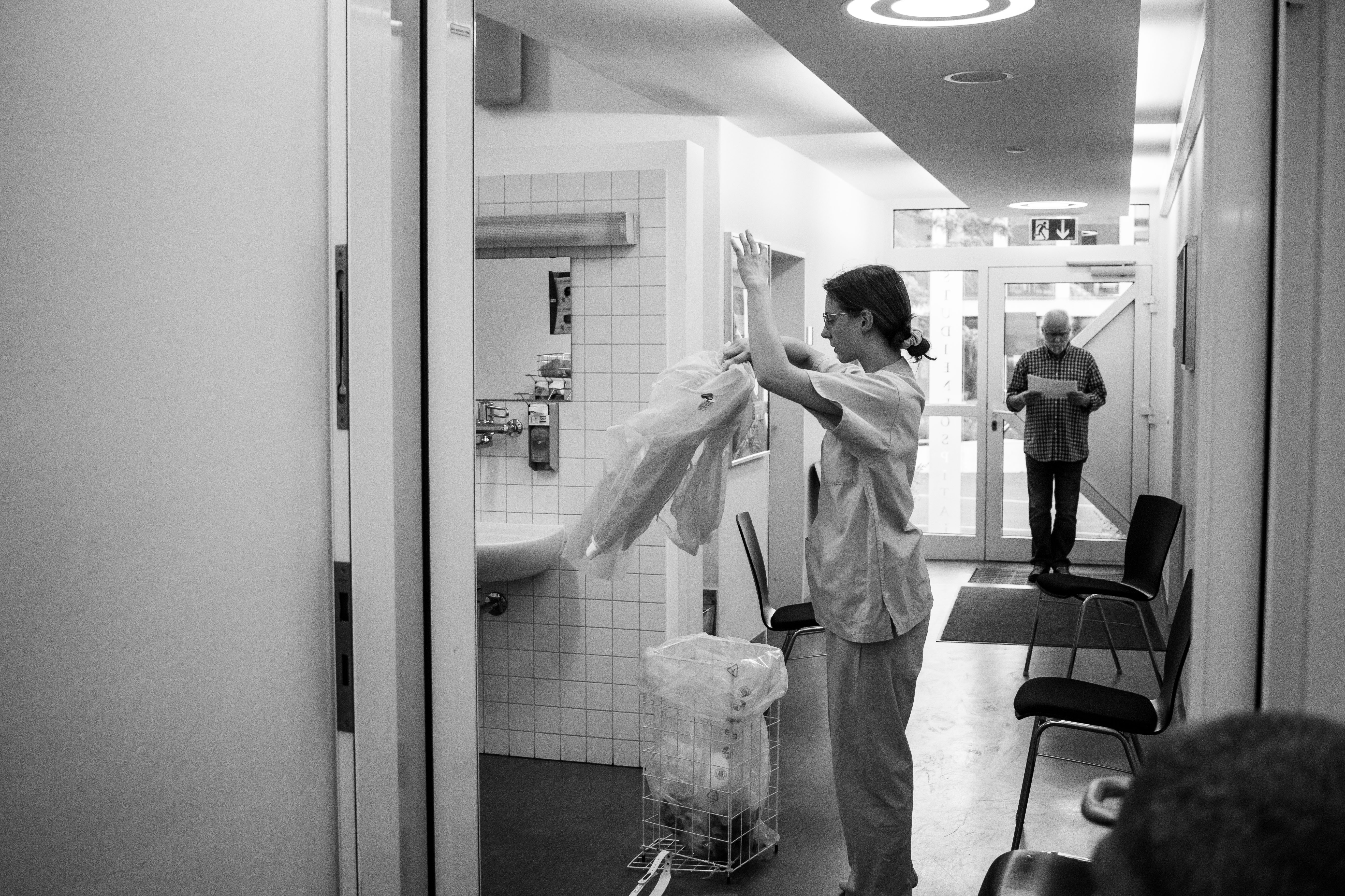 Aufgeben ist keine Option Nachpandemische Zeiten - Eine performative Erklärung Performance Ort: Studienhospital® Unter der Berufskleidung stecken Menschen, Menschen, die unter der Belastung der letzten drei Jahre an ihr Limit gekommen sind. Auch die grenzen des Gesundheitssystems sind sichtbar geworden. Fehlende Arbeitskräfte auf allen Ebenen. Und doch wagen wir zu hoffen: auf verbesserte Strukturen, interprofessionelles Arbeiten, flache Hierarchien, öffentliche Sichtbarkeit und Respekt. Zur Vergrößerung des Bildes, anklicken. Ensemble: Lisanne Petry; Bärbel Breimann, Uwe Lieb Performative Erarbeitung: Franz Bernhard Schrewe Fotokunst: Ingrid Hagenheinrich. Link zum Videoclip Die Station entstand durch das Projekt: - DIE REISE ZUM ENDE VOM ENDE DER WELT - des Stadtensembles Münster im Zeitraum vom 03.06.2023 - .06.2023 an zwei Wochenenden. Ich danke nachdrücklich nochmal für die hervorragende Organisation. www.stadtensemble.de |