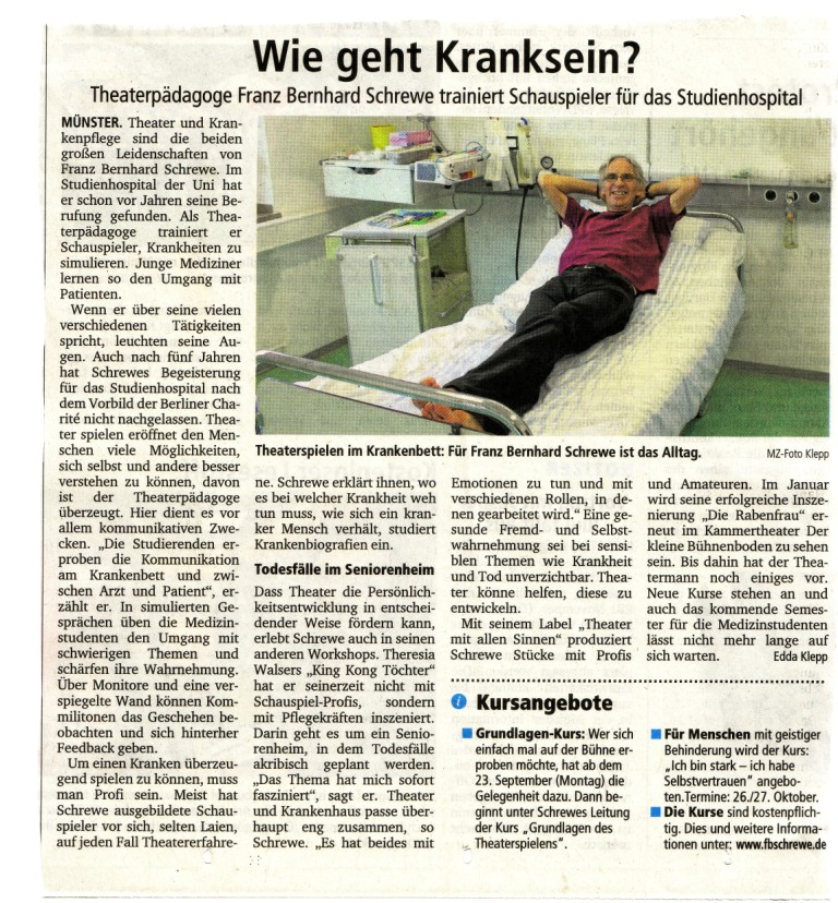 ![]() Wie geht Kranksein. Theaterpädagoge Franz Bernhard Schrewe trainiert Schauspieler für das Studienhospital MZ 09.09.2013 |